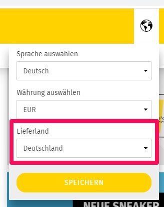 Ich sagte ihr: Klicke auf das Schliessen-Kreuz und waehle anschliessend am oberen Bildschirmrand mit Klick auf die Weltkugel und dem angefuegten DE deine Lieferadresse aus.