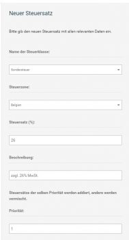 - unter Steuersätze je Steuerzone einen Steuersatz erstellen und der Steuerklasse hinzufügen (hier z.B. ein Steuersatz für Belgien mit 26%, zugewiesen zur Steuerklasse ‘Sondersteuer’)