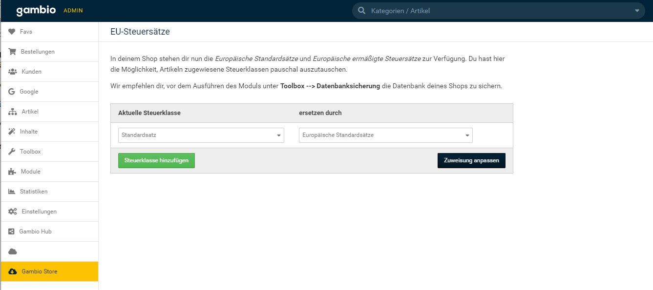 Wir werden euch über ein Modul im Gambio Store zwei neue Steuerklassen und eine Möglichkeit der pauschalen Zuweisung zur Verfügung stellen (geplante Kompatibilität: ab v3.9 über den AutoUpdater).