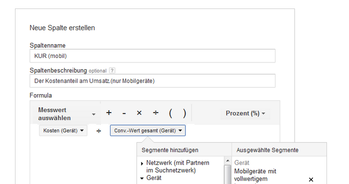 Nach der Ankündigung, dass bei Google AdWords für benutzerdefinierte Spalten arithmetische Formeln zur Verfügung gestellt werden, konnte die Funktion bereits in AdWords Konten gefunden werden. Mit benutzerdefinierten Spalten konnten sich Nutzer bisher alle Zahlen, die sie auf einen Blick haben wollten, nach vorne holen. Doch ermöglicht die neue Funktion nun eine noch genauere Erfolgsmessung, da nun beispielsweise verschiedene Metriken in einer Formel kombiniert werden können.