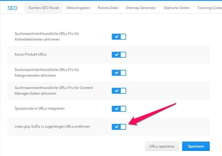 Für alle diejenigen, die das index.php gerne weiterhin in der Dresszeile sichtbar haben möchten, gibt es unter Shop Einstellungen –> SEO –> Gambio SEO Boost den entsprechenden Knopf.