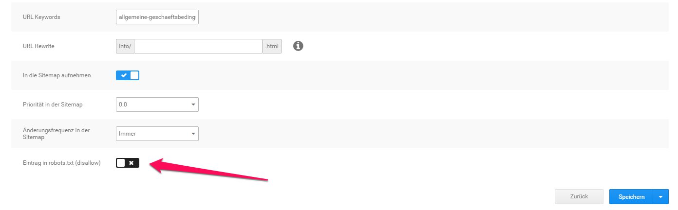 Den Eintrag in die robots.txt könnt ihr jeweils im Bearbeitungsmodus der einzelnen Contents vornehmen.