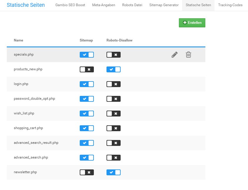 Unter Shop Einstellungen –> SEO –> Statische Seiten haben wir für euch die Option geschaffen, statische Seiten wie z.B. die specials.php (Angebote) oder die shopping_cart.php (Warenkorb) per Knopfdruck in die Sitemap oder die robots.txt aufzunehmen: