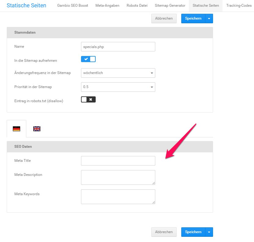 Im Gambio-Shop Meta-Angaben für statische Seiten hinterlegen - SEO-Update