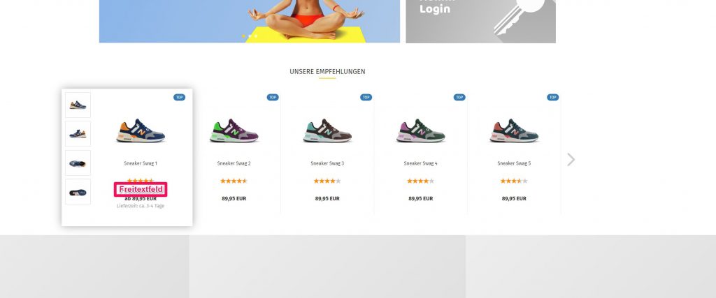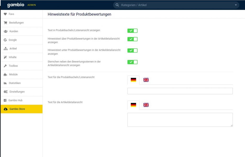 In der Detailansicht eines Artikels habt ihr die Option, über und/oder unter den Bewertungen einen Freitext anzuzeigen: