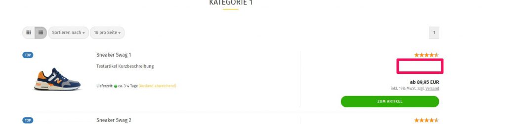 In den Produktkacheln oder auch der Listenansicht für Kategorien, könnt ihr unter den Bewertungssternen einen Freitext anzeigen, in dem ihr darauf hinweisen könnt, ob eure Bewertungen geprüft wurden oder nicht: