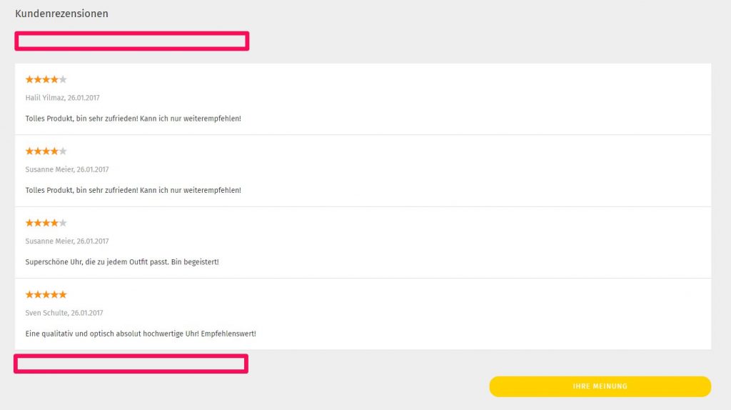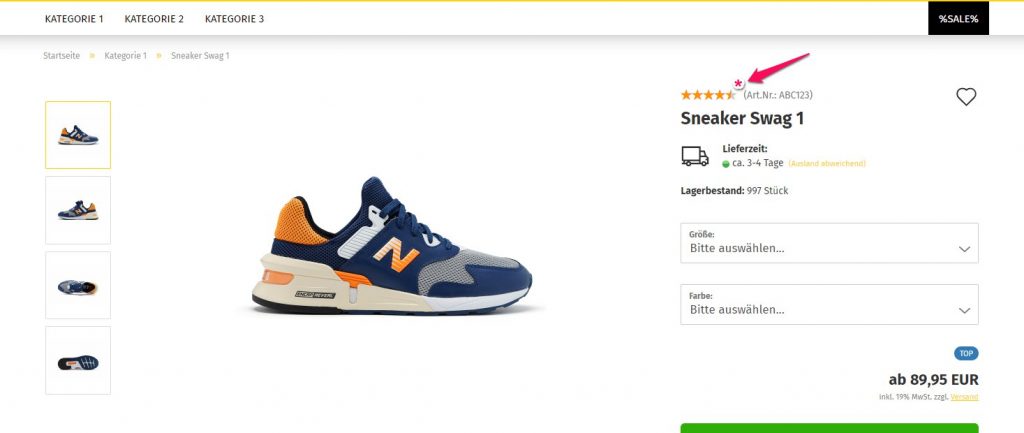 Mit einem Klick auf Bewertungssterne neben den Produktbildern gelangen Besucherinnen und Besucher zu den Produktbewertungen weiter unten. Hier könnt ihr ein kleines Hinweissternchen einblenden, das ihr dann z.B. im Freitext bei den Bewertungen wieder aufnehmt, um es zu erläutern.