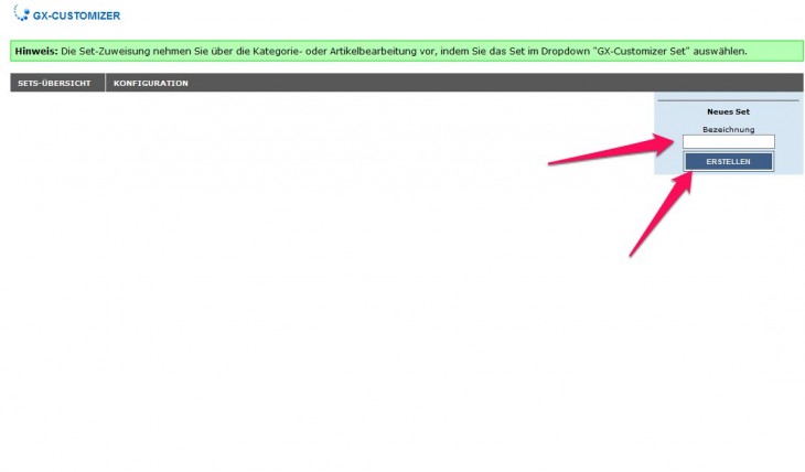 Um ein Customizer-Set anzulegen, wählen Sie im Admin-Bereich Ihres Gambio-Shops unter „Artikel“ den Punkt „GX-Customizer“. Hier ist es möglich in dem Feld „Bezeichnung“ einen Namen für das Customizer-Set zu vergeben. Betätigen Sie anschließend den Button „Erstellen“.