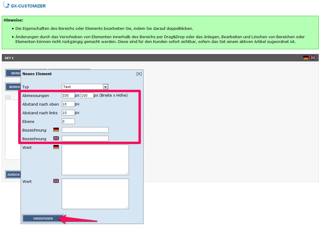 Der nächste Screenshot zeigt, welche Parameter für die generelle Anpassung von Elementen wichtig sind. Es müssen die Abmessungen (Breite und Höhe), der Abstand nach oben und nach links und die Bezeichnung des Elements eingetragen werden. Wie oben beschrieben, sind je nach Element weitere Anpassungen vorzunehmen. Klicken Sie nach der Anpassung auf „Hinzufügen“, um das bearbeitete Set-Element in den vorher definierten Bereich einzufügen.
