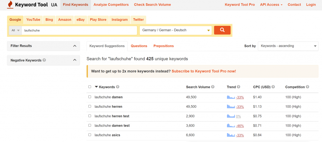 Bereits in der kostenfreien Version liefert das Tool Unmengen an Suggestions, die in der Google-Suche auf manuellem Weg nicht so schnell ans Tageslicht kommen würden. Zum Begriff Laufschuhe werden insgesamt 425 Keyword-Kombinationen ausgegeben:
