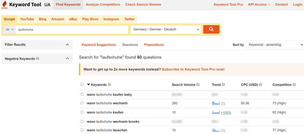 Diese Suggestions lassen sich für einzelne Begriffe natürlich manuell abfragen, viel bequemer ist dies allerdings mit Hilfe eines der vielen SEO-Tools die der Markt zu bieten hat. Ein solches Tool ist beispielsweise keywordtool.io.