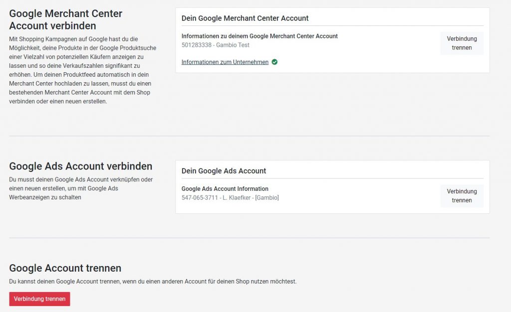 - Verknüpfe dein neues Google Ads Konto über den Google-Tab im Gambio Admin. Wenn du noch kein Ads-Konto hast, kannst du dort direkt eines erstellen.