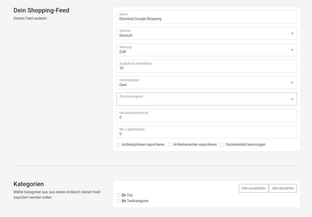 Wie bisher auch könnt ihr die Produkte aus eurem Shop manuell als Feed zu Google exportieren. Dabei könnt ihr nicht nur festlegen, welche Produkte in eurem Feed enthalten sein sollen, sondern habt auch eine ganze Reihe an weiteren Konfigurationsmöglichkeiten: