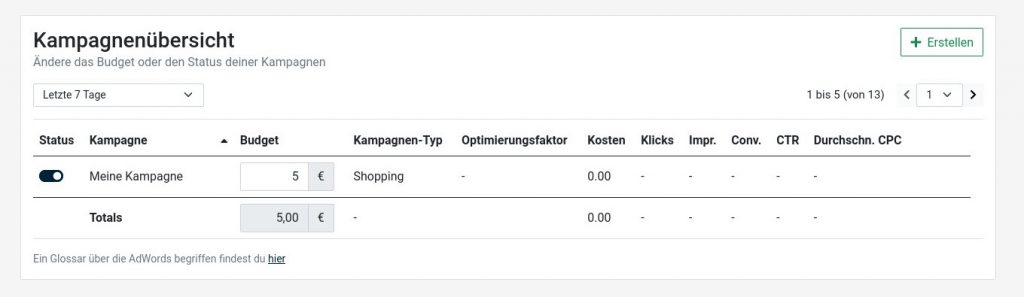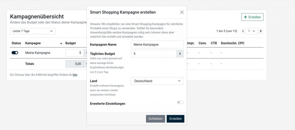 Nach der Einrichtung erstellt bzw. aktiviert ihr euren Produktfeed und könnt dann eure Smart Shopping Campaign erstellen und konfigurieren.