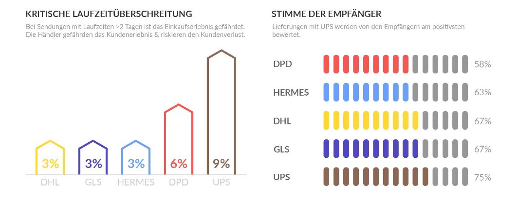 Ungeachtet der relativ schlechten Quote bei der schnellen Zustellung ist UPS die Nummer 1 in Sachen Kundenzufriedenheit: 75% der Lieferungen werden insgesamt positiv bewertet.