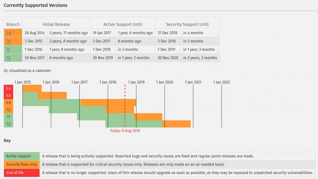 Für die Versionen 5.6 und sogar 7.0 ist nur noch eingeschränkter Support vorhanden. Hier wird also nur noch eingegriffen, wenn es wirklich sein muss.