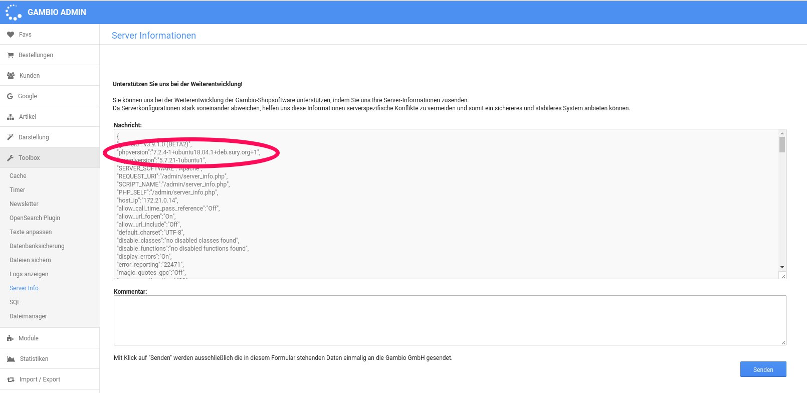 Unter Toolbox –> Server Info könnt ihr im Adminbereich eures Shop nachschauen, welche PHP-Version bei euch auf dem Server läuft. Das sieht dann in etwa so aus: