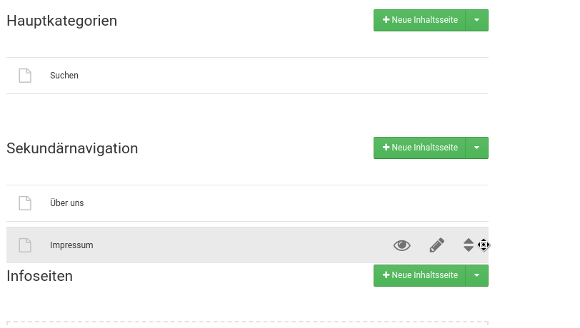 Bereiche wie das Impressum stellen dabei einen Seiten-Content dar, während die Startseiten-Contents als Element-Contents gemeinsam die Startseite bilden.