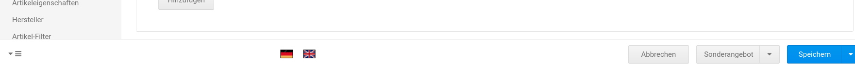 Die Schaltflächen auf der Speichern-Leiste werden dabei abhängig vom geöffneten Bereich im Gambio Admin dargestellt (z. B. Schaltflächen für “Sonderangebote” nur bei der Artikelbearbeitung).