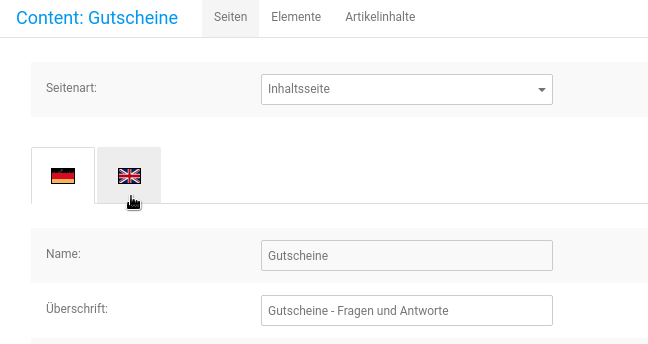 Contents werden jetzt sprachabhängig dargestellt, das heißt die deutsche und englische Variante eines Contents kann über Reiter direkt bearbeitet werden. Ebenso werden weitere Sprachen angezeigt, insofern noch andere Sprachen im Shop installiert sind.