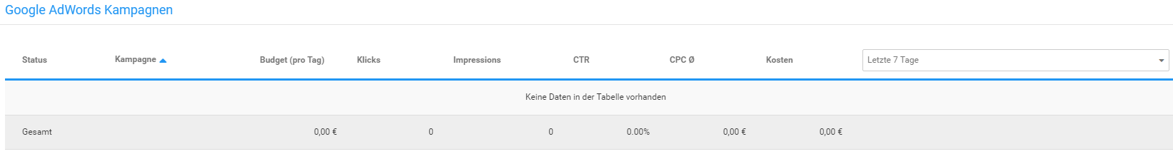 Unter dem Menüpunkt Google > Google AdWords können Daten aus Google AdWords-Kampagnen ausgewertet werden. Dabei werden folgende Optionen angezeigt: