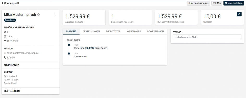 Ebenso haben wir die Ansicht komplett neu gestaltet und die Kundeninformationen neu gruppiert. Hinzu gekommen sind dabei Möglichkeiten, um Warenkorb und Merkzettel des Kunden schneller einzusehen, seine Bewertungen zu lesen und auch zu schauen, welchen Umsatz der Kunde bisher im Shop gemacht hat.
