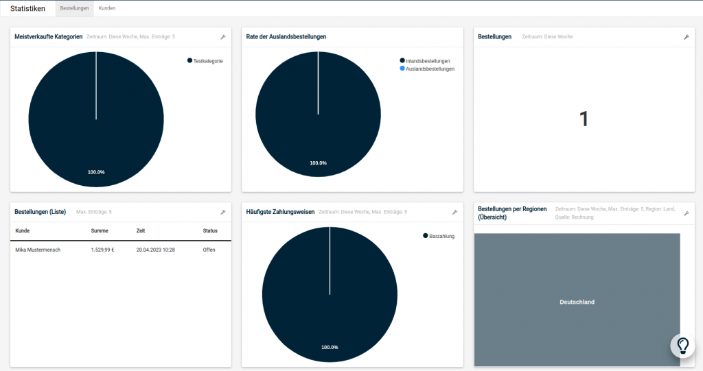 Die Statistik-Übersicht wurde überarbeitet und weitere neue Widgets hinzugefügt. Die einzelnen Widgets können zwar nicht länger in der Größe verändert werden, aber weiter frei angeordnet werden. Neu ist auch die Einteilung in die Bereiche „Bestellungen“ und „Kunden“.