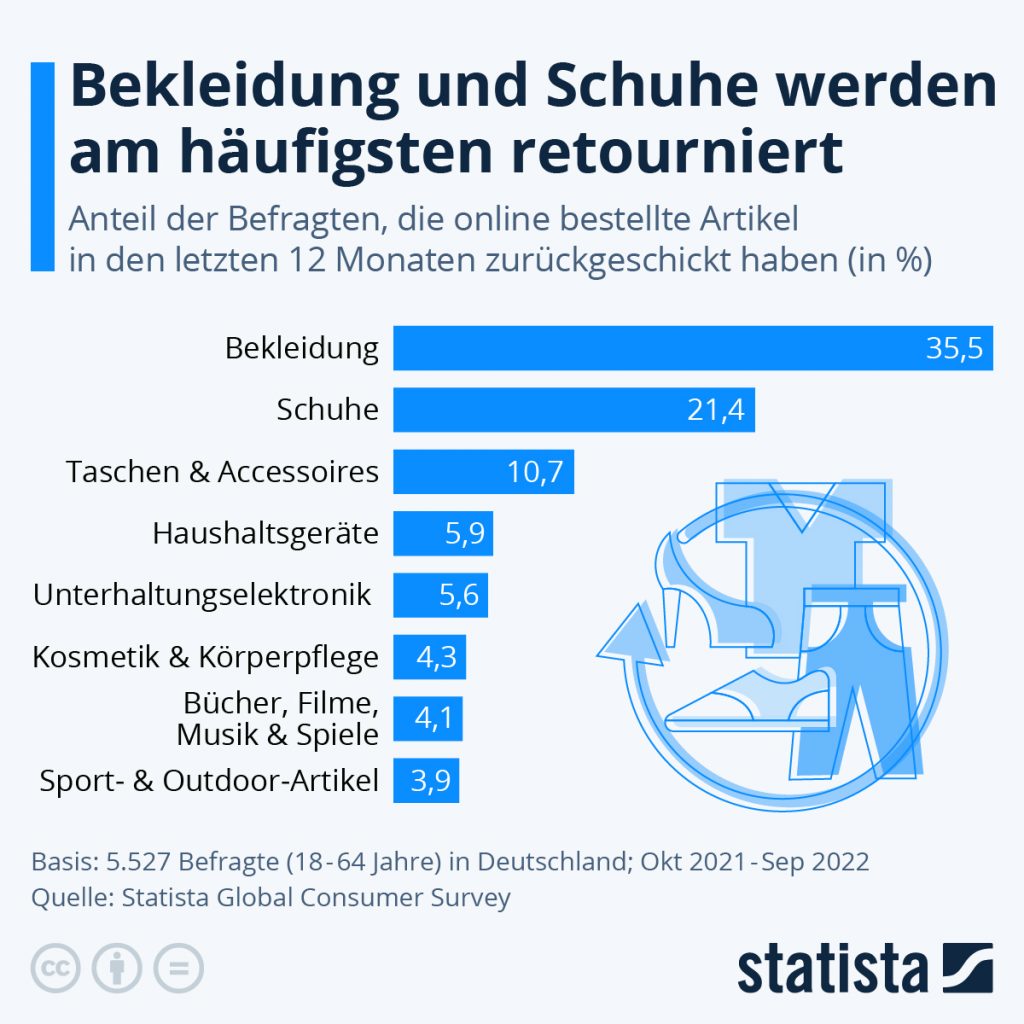 Die folgende Abbildung zeigt, welche Produkte am häufigsten zurückgeschickt werden. Daraus lässt sich erkennen, dass mit 35,5 % Bekleidung generell viele Retouren stattfinden. Auf dem zweiten Platz befinden sich Schuhe mit 21,4 %.