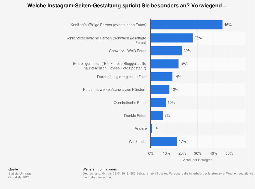 In Form einer Umfrage von Statista wurden die Befragten darum gebeten, zu beantworten, welche Instagram-Seiten-Gestaltung sie besonders anspricht. Der Großteil mit 46 Prozent gab an, dass sie vorwiegend knallige/ auffällige Farben ansprechend finden. Nur 27 Prozent bekunden, dass sie schlichte/ schwache Farben bevorzugen. Natürlich kommt es auch immer auf das Image und deine Farbgestaltung an. Du solltest nichts veröffentlichen, dass dich und deinen Onlineshop nicht richtig widerspiegelt und präsentiert. Aber schau ruhig öfter in Statistiken, beispielsweise deine Insights auf Instagram und Facebook, um nachzuvollziehen, was momentan am besten bei den Nutzer:innen ankommt. Und dann passe es an deinen eigenen Stil an.
