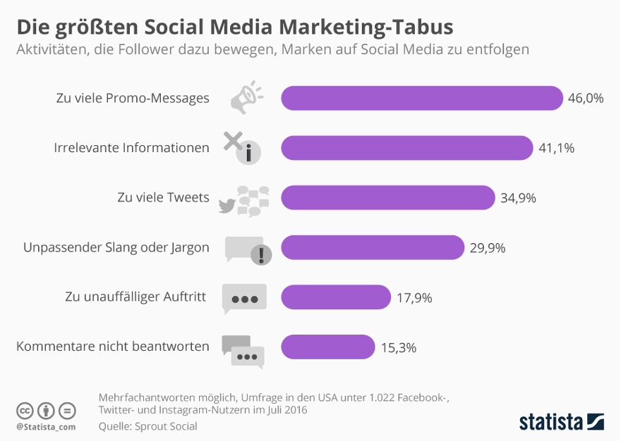 Es kann eine Herausforderung sein, den Geschmack deiner Zielgruppe hinsichtlich des Contents zu treffen. Laut einer Studie sind die Ansprüche der Nutzer:innen oft höher als zuvor angenommen. Aber lass dich davon nicht ins Bockhorn jagen. Wir versuchen ein bisschen zu unterstützen. Also was sind die größten Social Media Tabus? Das zeigt dir die folgende Abbildung.