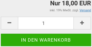 - In den Warenkorb: Eine der wichtigsten Aktionen in einem Onlineshop. Buttons mit diesem Styling haben immer die Funktion, den Artikel in den Warenkorb zu legen. Dies ist aus der Artikelauflistung in der Listenansicht oder auf der Artikel-Detailseite möglich. Ausnahme bilden hier die Artikel, die Eigenschaften oder Attribute haben. Da diese noch auf der Artikeldetailseite konfiguriert werden müssen, nimmt der Button auf der Listenansicht die Funktion einer Weiterleitung auf die Artikeldetailseite ein.