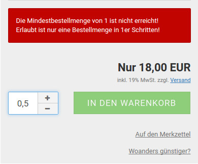 - Fehler: Wenn zum Beispiel eine ungültige Eigenschaftenkombination oder eine nicht vorgesehene Artikelmenge in den Warenkorb gelegt werden soll, wird dem Kunden ein Fehler-Hinweis angezeigt.