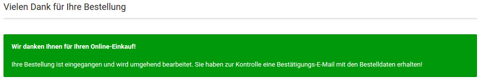 - Erfolg: Nach dem erfolgreichen Abschluss einer Bestellung wird dem Kunden dieser Erfolgshinweis angezeigt.