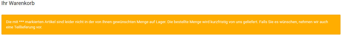 - Warnung: Diese Meldung wird dem Kunden zum Beispiel dann angezeigt, wenn er ein Produkt in den Warenkorb gelegt hat, das nicht mehr vorrätig aber trotzdem noch bestellbar ist.