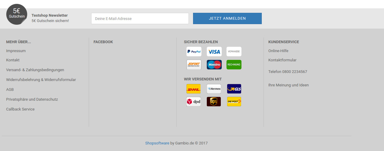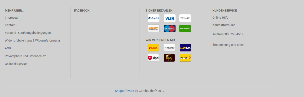 Die anderen drei Spalten können von euch mit beliebigen Content befüllt werden. Dies ist möglich mit den betreffenden Einträgen im Content Manager. Hier lassen sich zum Beispiel Informationen zu Zahlungsarten und Versand-Methoden oder Verlinkungen zu Social Media Kanälen platzieren.