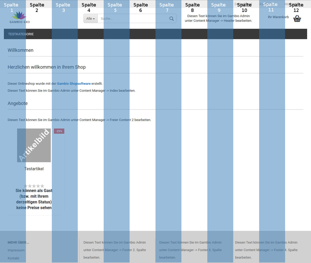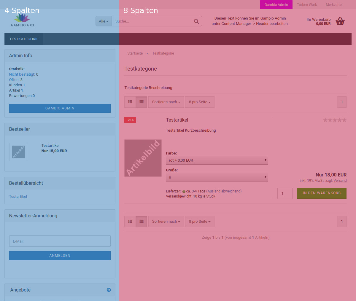 Die Hauptspalte ist der Inhaltsbereich eures Shops. Hier werden die Artikel angezeigt, also das, was einen Shop letztlich ausmacht. Die Hauptspalte kann, je nachdem, wie ihr sie konfiguriert habt, über die gesamte Breite gehen oder teilt sich den Platz mit der linken Spalte, sofern diese aktiviert ist.