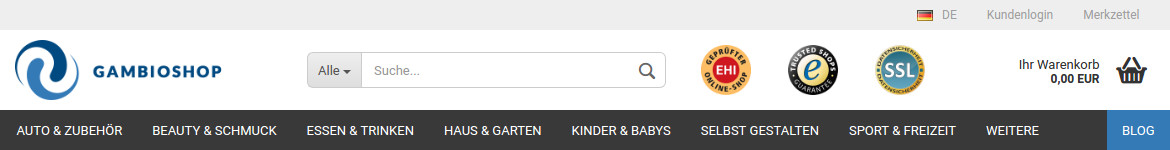 Beim Header handelt es sich um den Kopfbereich der Seite. Hier wird unter anderem das Logo des Shops, die Suche und der kleine Warenkorb angezeigt. In unserem Testshop 1 sieht der Header folgendermaßen aus: