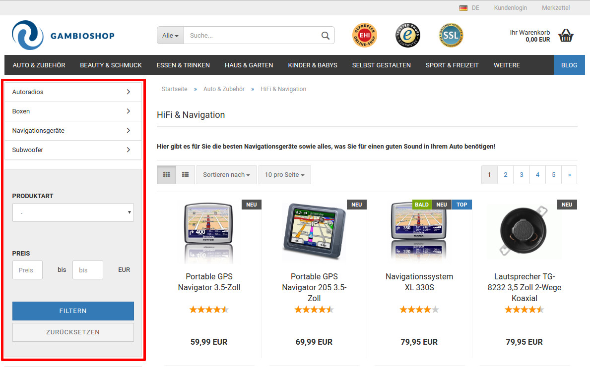 Die linke Spalte kann im Shop dazu genutzt werden, zusätzliche Informationen mit Hilfe der Menüboxen und dem vertikalen Kategorie-Menü anzuzeigen. Welche Boxen an welcher Position in der linken Spalte angezeigt werden sollen, kann auch im StyleEdit 3 konfiguriert werden. Darüber hinaus kann eingestellt werden, auf welchen Seiten die linke Spalte angezeigt werden soll.