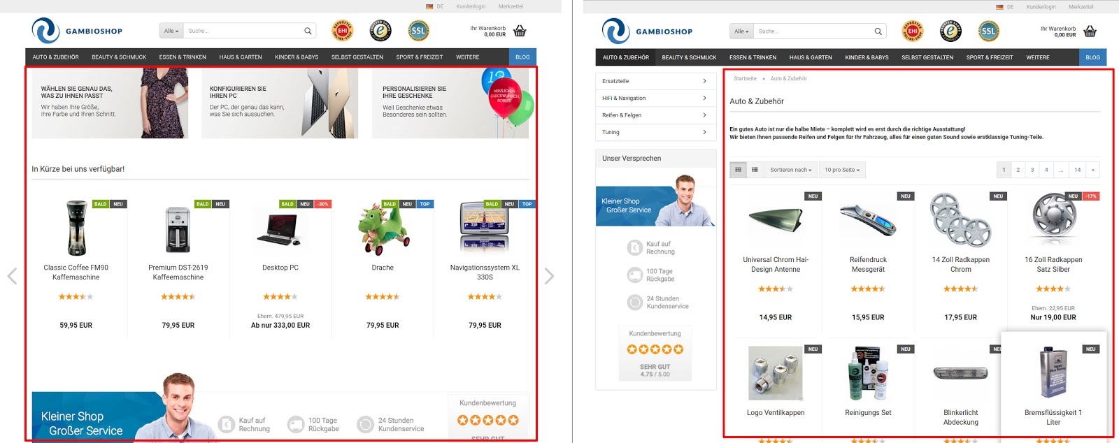 - Teaser-Slider: Wie vorher bereits erwähnt, handelt es sich hierbei um ein Element, das Bilder beinhaltet, die automatisch nach links oder rechts gescrollt werden. Dieser kann auf der Startseite, auf Content- oder Produktseiten platziert werden, um auf Aktionen oder Sonderangebote hinzuweisen.