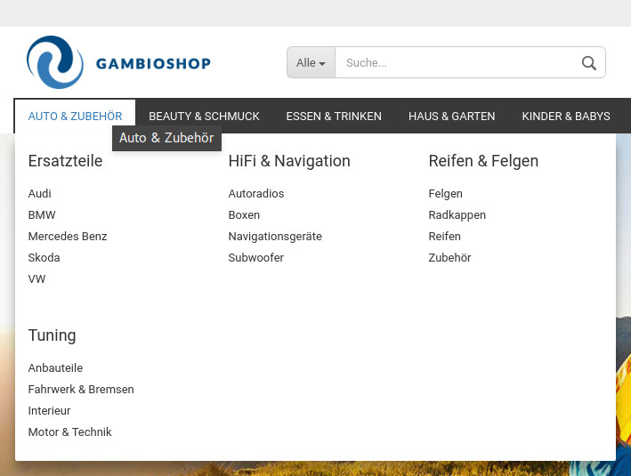 Beim Hovern über einer der Hauptkategorien (wenn Unterkategorien enthalten sind) öffnet sich ein Menü, das Mega-Dropdown genannt wird. Hier werden alle Unterkategorien und, falls so konfiguriert, deren Kindkategorien angezeigt, sodass das Mega-Dropdown ein zentrales Navigationselement des Shops darstellt.