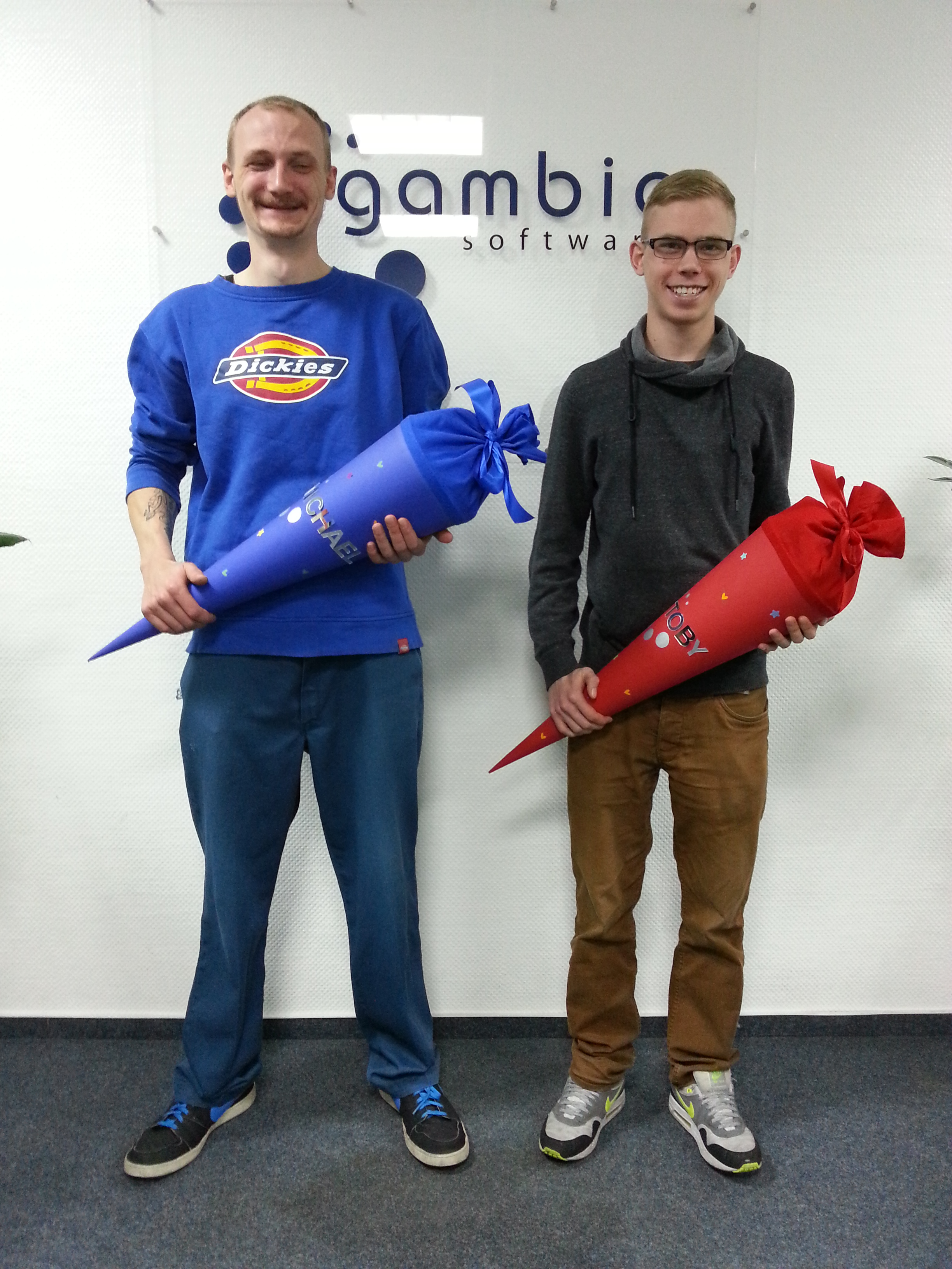 Michael (links im Bild) hat letzten Monat seine Umschulung zum Fachinformatiker für Anwendungsentwicklung bei uns gestartet und wird derzeit mit den Abläufen in unserer Customizing-Abteilung vertraut gemacht. Toby (rechts im Bild) macht ebenfalls eine Ausbilung zum Fachinformatiker für Anwendungsentwicklung und unterstützt unser Core-Entwicklerteam. Manche Gambio-Kenner werden Toby bereits kennen – tatsächlich hat er nämlich schon sein praktisches Jahr für die Fachholschulreife bei uns absolviert und gehört daher schon fest zum Inventar.