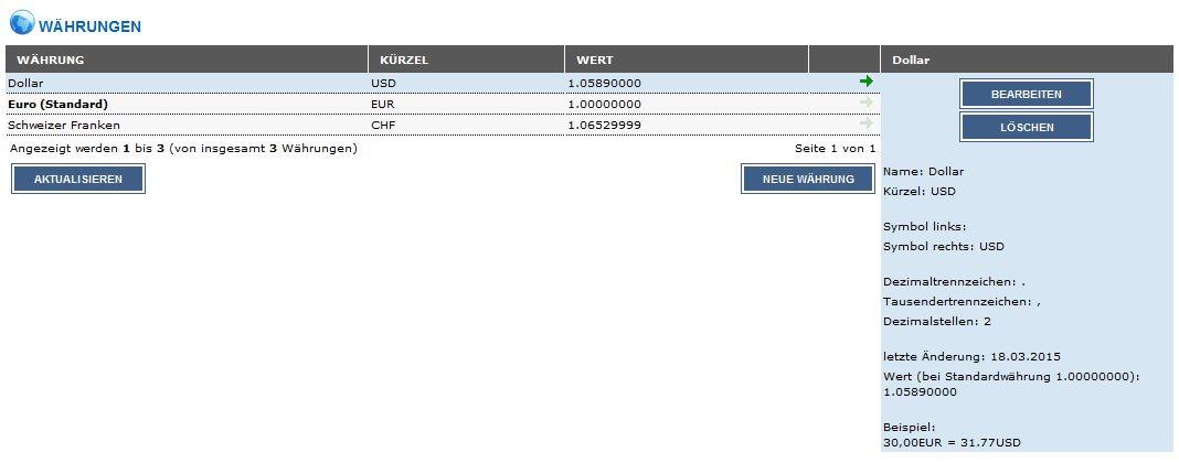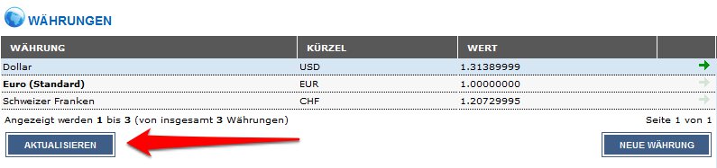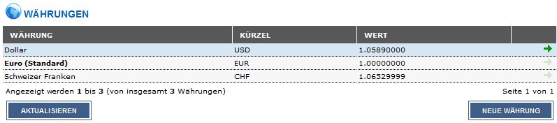 Unter Umständen können einzelne Währungskurse nicht aktualisiert werden. Ob alle Währungskurse aktualisiert werden konnten, sehen Sie in den Erfolgs- und Fehlermeldungen oberhalb des Administrationsbereichs. Wenn das Abrufen eines Wechselkurses fehlschlägt, führen Sie die Aktion erneut aus.