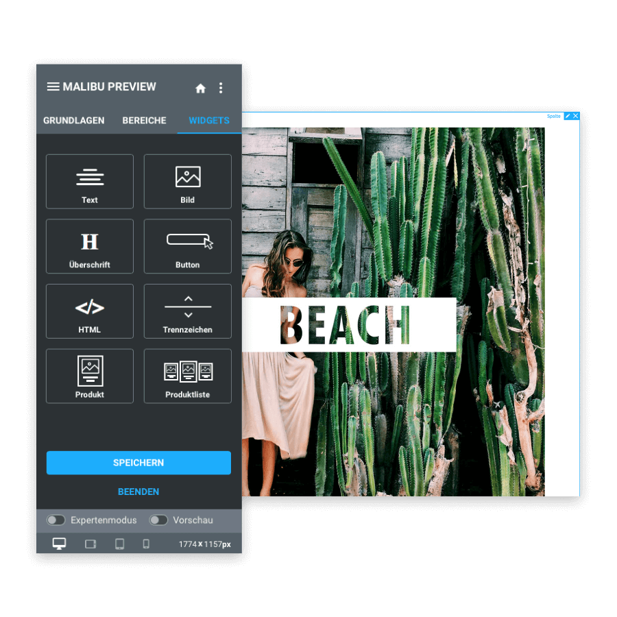 Platziere Inhaltselemente wie Texte, Bilder, Produkte oder eigene HTML-Blöcke ganz einfach per Drag-and-Drop an den gewünschten Stellen im Shop. Auch hier kannst du das Ergebnis direkt in der Vorschau überprüfen. Spätestens jetzt ist dein Onlineshop ein Unikat und natürlich gibt es keinen schöneren Shop als deinen.