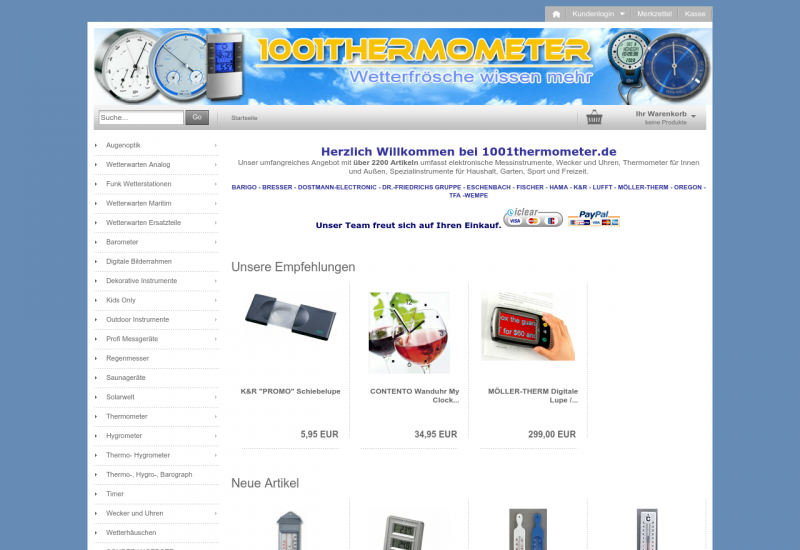 1001thermometer.de - Ihr umfangreicher Shopanbieter für Artikel rund ums Wetter, Outdoorinstrumente - zur Zeit ca. 1600 Artikel. Sie finden bei uns alle Artikel aus dem aktuellen Programm von BARIGO - ESCHENBACH - FISCHER - K&R - TFA - MÖLLER-THERM - OREGON. Unser Team freut sich auf Ihren Einkauf.