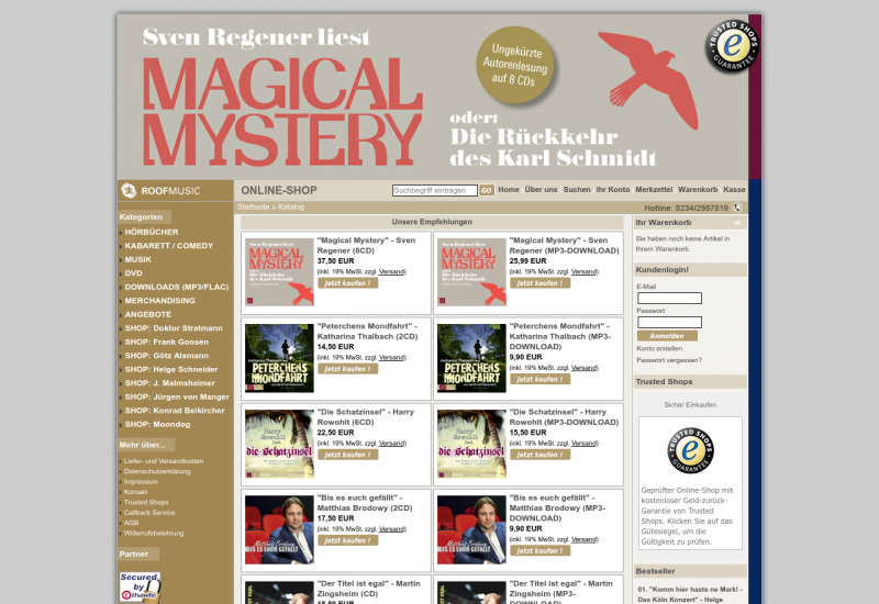 Online-Shop der ROOF Music GmbH mit Musik, Hörbuch und Kabarett-CDs sowie Downloads ohe DRM mit Tiefpreisgarantie. Künstler u.a.: Hape Kerkeling, Helge Schneider, Götz Alsmann, Frank Goosen, Bastian Pastewka, u.v.a.