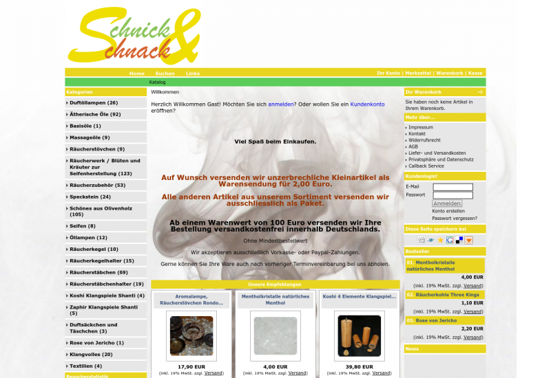 Onlineshop für Schnick & Schnack - ein Erlebnis für die Sinne.Versand von Räucherwerk und Räucherzubehör, Artikeln aus Olivenholz und Speckstein, Räucherstäbchen und -halter, Räucherkegel und -halter, Ätherische Öle und bald noch vieles mehr