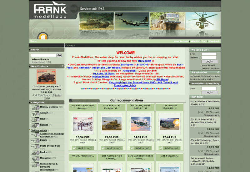 Herzlich willkommen auf Frank Modellbau, Ihrer Top Adresse im Internet für den Modellbau. Unser großes Sortiment bietet Ihnen neben hochwertigen Fertigmodellen und Plastikmodellen auch Modellbauzubehör, Werkzeuge und Fachliteratur rund um Ihr Hobby.