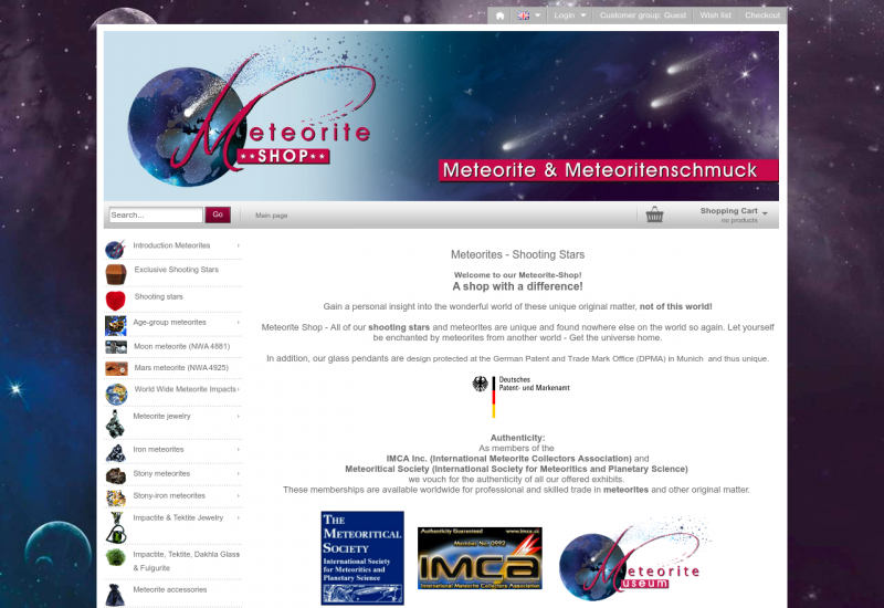 Hier finden Sie eine elitäre Auswahl an: Meteoriten (Sternschnuppen), Meteoriten Schmuck, Impaktgläser (Indochinite, Moldavite, Libysches Wüstenglas oder Irghizite), Fulgurite, Meteoriten Zubehör, Meteoriten Filme, Meteoriten Bücher sowie Glücksbringer Sternschnuppen aus dieser faszienierenden Materie in verschiedenen Ausführungen! All unsere Sternschnuppen und Meteoriten sind Unikate und nirgendwo sonst auf der Welt so noch einmal zu finden. Lassen auch Sie sich verzaubern von Meteoriten aus einer anderen Welt - Holen Sie sich das Universum nach Hause.