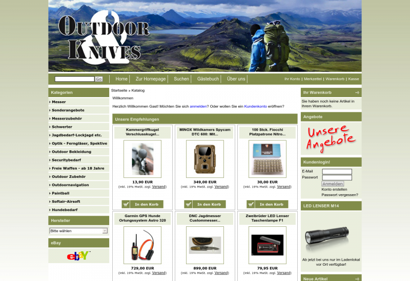 Artikel für den Outdoorbedarf von Blundstone, Aigle, Herbertz, Böker, Zeiss, Leica, Minox, Puma, Neverlost, Fiskars, Benchmade, Kai Küchenmesser, Salewa, und vielem mehr.