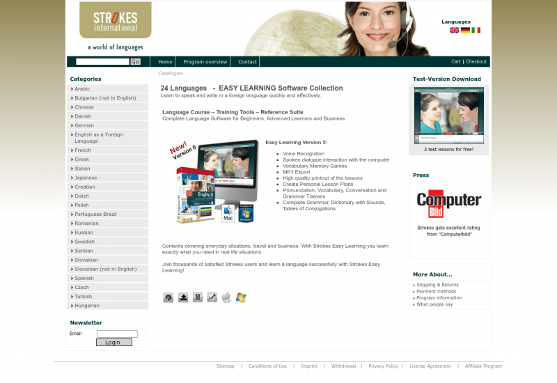 Wir verkaufen weltweit Sprachsoftware in 24 verschiedenen Sprachen. Die Software ist sowohl für Mac als auch für Windows geeignet und bietet Lernstoff für Anfänger, Fortgeschrittene und Business.